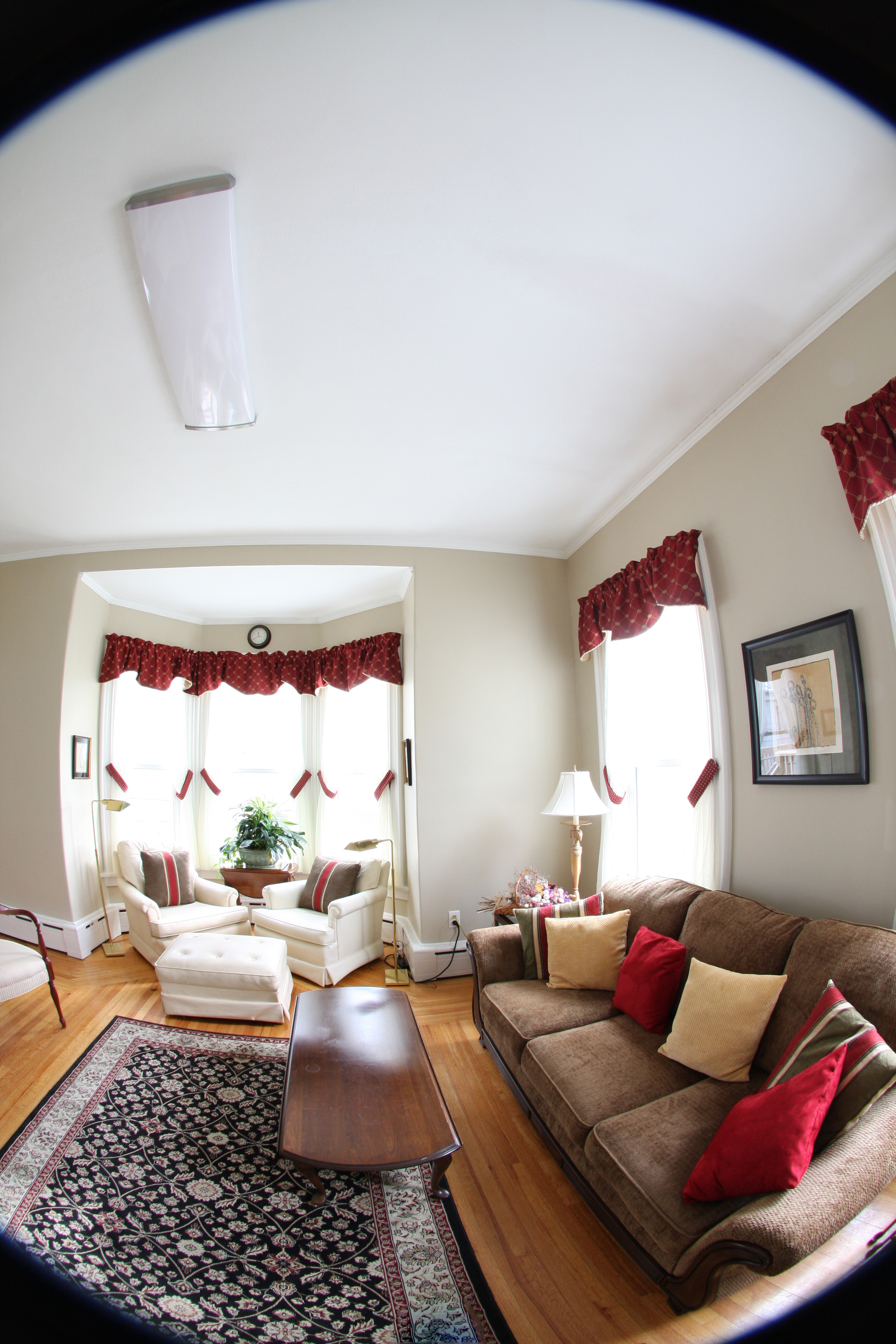 This fisheye lens image was taken as a series for a panoramic tour of this community center. It will be merged with other shots so that the vignetted corners and fringe will not show in the final scene, but the tripod knob in the bottom center has to go. I previously had my tripod configured to keep the knob out of the picture, but that setup did not work on this day.